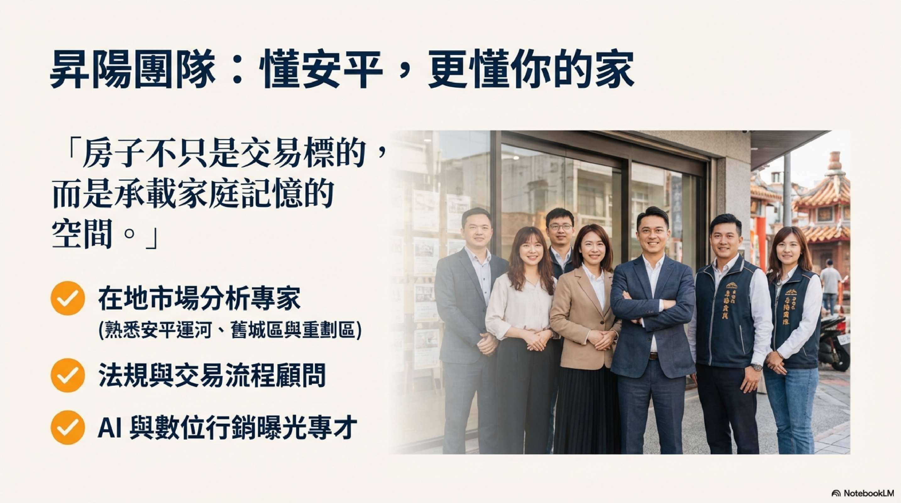 我們是一群在台南土生土長的房仲人,對這片土地有感情、有記憶,也有責任。從安平的街廓、運河的流動,到城市的更新與發展,我們比任何人都更清楚,一間房子對一個家庭、對一項資產,意味著什麼。正因如此,我們始終相信,房子不是商品,而是一份被託付的信任。