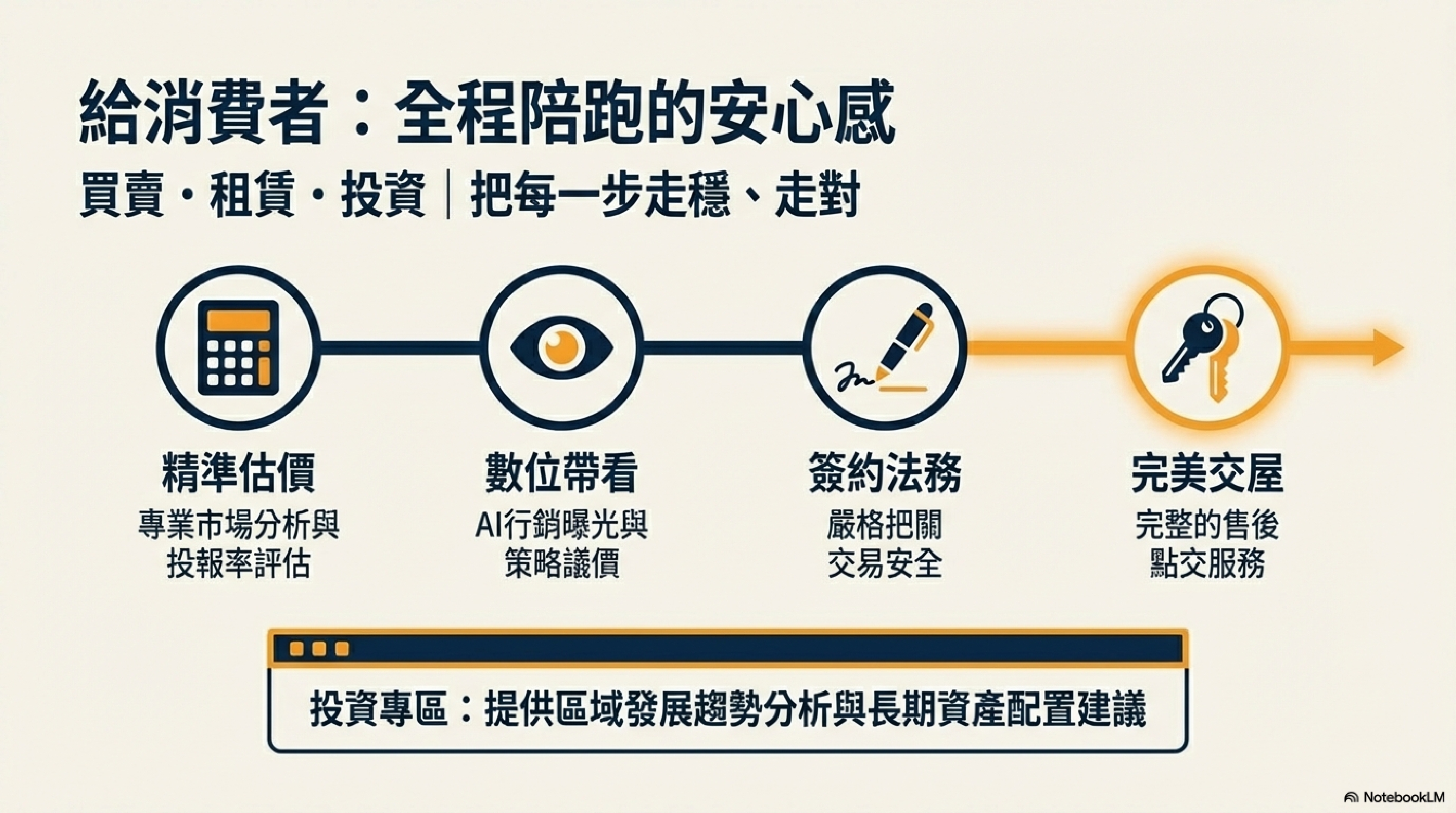 估價、帶看、議價、簽約到交屋,一步不漏,安心感拉滿。