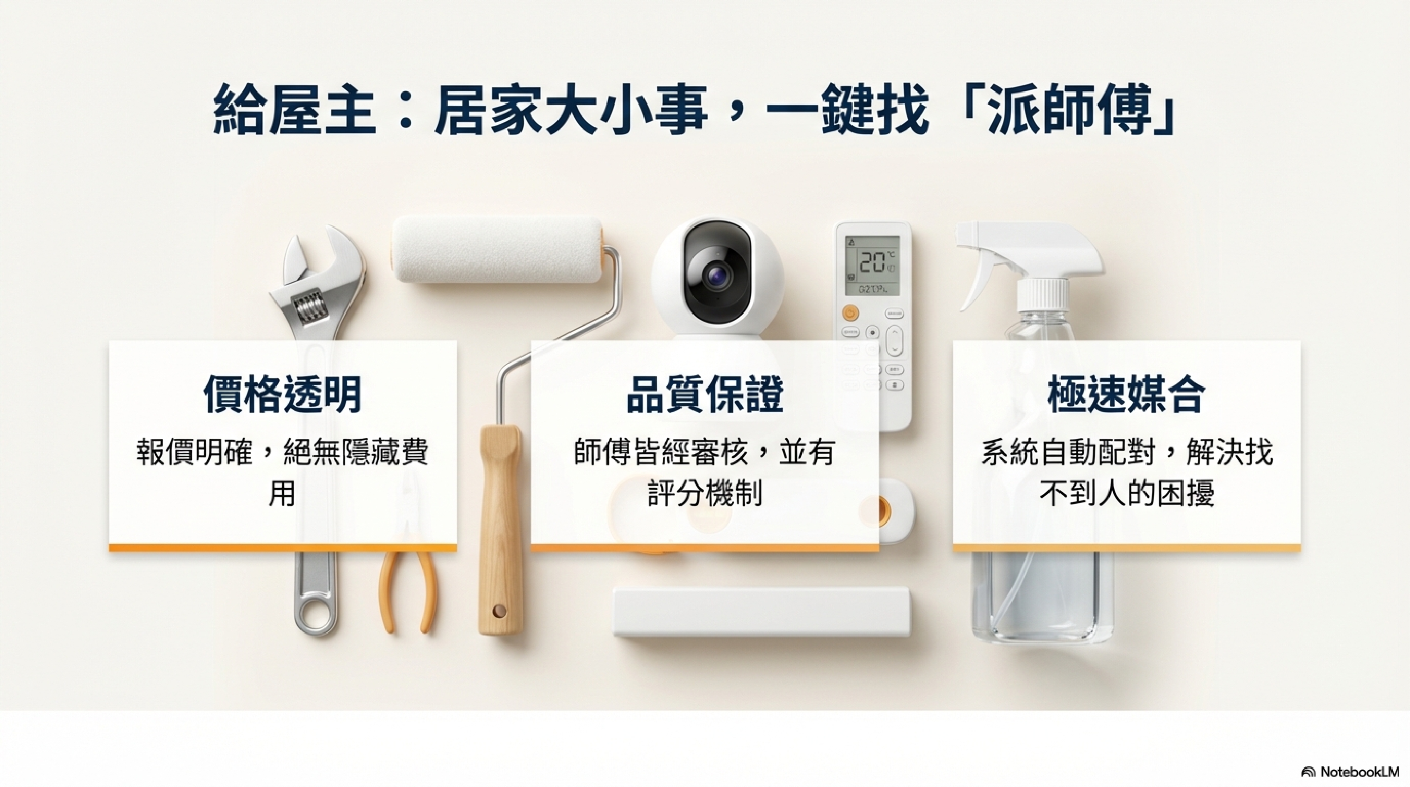 1. 為什麼要加入派師傅平台?答:我們提供 透明的客戶需求,讓廠商快速匹配客戶,提升接單效率!提供 平台支持與行銷推廣,幫助您的品牌曝光,吸引更多潛在客戶。評價機制 讓優質廠商脫穎而出,建立信譽,贏得更多信任與合作!2. 我需要提供什麼資料才能入住平台?答:公司或個人 基本資料(包含公司名稱、聯絡方式)。服務項目 說明(如水電修繕、居家清潔等)。必要的 相關證照或執業資格(若適用)。服務前的 形象照片或案例作品,以便吸引客戶。3. 入住平台需要支付什麼費用?答:初次入住費用:支付一次性平台建置費用,協助您設置專屬頁面。行銷推廣費用:可選擇加入我們的行銷方案,提升您的服務曝光度。平台服務費:成功..